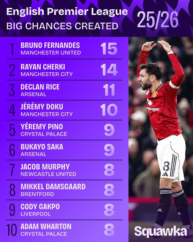 英超23輪過后,布魯諾-費爾南德斯以10次助攻領跑英超助攻榜,據數據機構Squawka統計,這位紅魔隊長也是本賽季英超創造絕佳機會最多的球員。