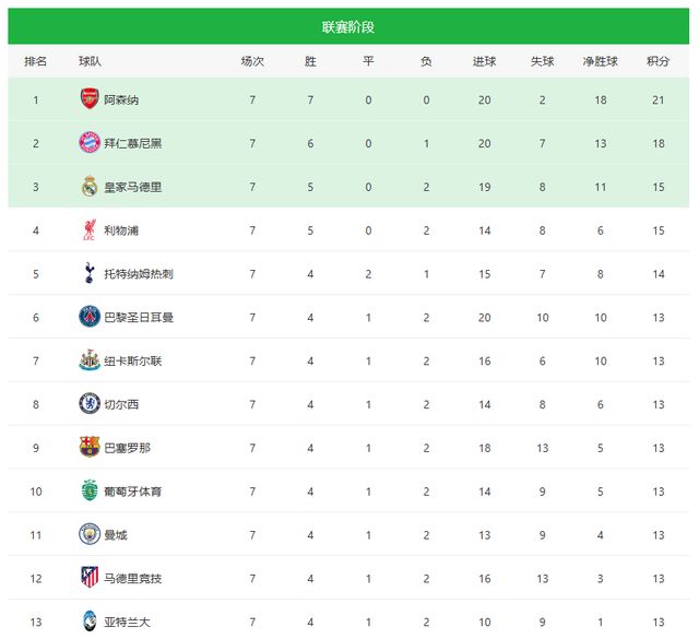 歐冠聯賽階段前7輪,巴黎圣日耳曼、紐卡、切爾西、巴薩、葡萄牙體育、曼城、馬競、亞特蘭大8支球隊均是4勝1平2負積13分,分別排名6-13位。13分4個凈勝球的曼城,暫時排名第11位。
