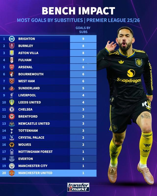 北京時間1月28日,德轉(zhuǎn)統(tǒng)計出了本賽季至今英超球隊替補進球數(shù)排行榜,布萊頓依靠替補球員打入9球排名第一,曼城和曼聯(lián)替補球員僅打入1球排名墊底。