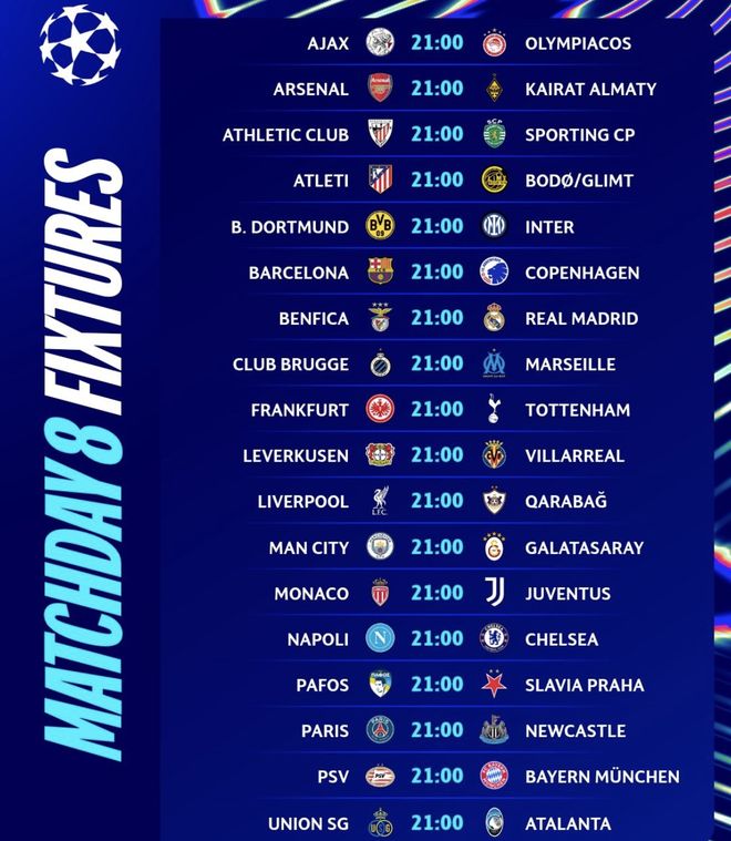 在第8輪的比賽中,只有阿森納主場對陣阿拉木圖凱拉特的比賽與出線席位之爭沒有關系,其余比賽都將決定著前8的產生。阿森納領先拜仁3分,比拜仁多5個凈勝球,基本鎖定榜首。拜仁將客戰埃因霍溫,只要取勝就將排名前2,從而在決賽前將避開阿森納。