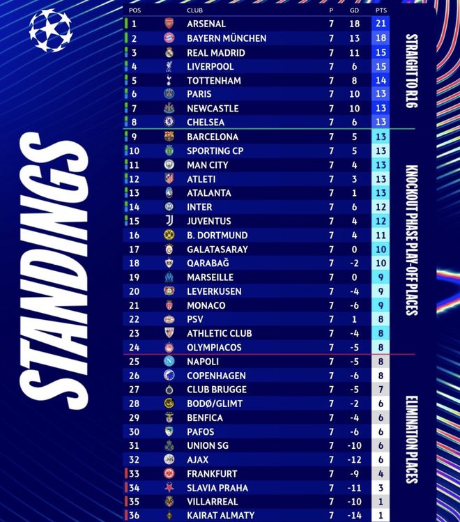 另外有4支球隊已經確定無緣淘汰賽,后4位的法蘭克福、布拉格斯拉維亞、比利亞雷亞爾以及阿拉木圖凱拉特均被淘汰出局。而目前排名第3-18位的球隊,從皇馬到卡拉巴赫,共16支球隊,都有直接出線從而躋身16強的機會。排名第19-32位的球隊,從馬賽到阿賈克斯,將為淘汰賽附加賽席位而戰。