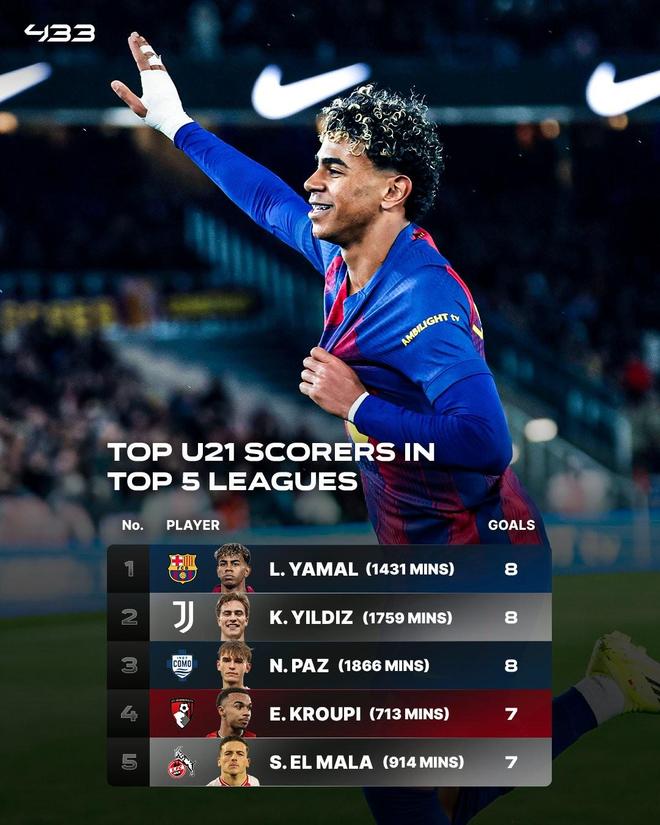 北京時間1月28日,知名媒體433統計出了本賽季至今歐洲五大聯賽U21球員進球榜,亞馬爾、凱南-伊爾迪茲以及尼科-帕斯同以8球并列第一。
