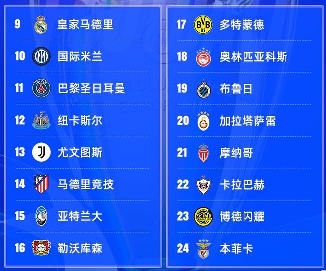 附加賽區(qū)包括了皇馬、國米、巴黎、紐卡、尤文、馬競、亞特蘭大、勒沃庫森這八支實(shí)力不俗的種子球隊(duì),及多特蒙德、奧林匹亞科斯、布魯日、加拉塔薩雷、摩納哥、卡拉巴赫、博德閃耀、本菲卡這八支不是種子卻實(shí)力不俗的球隊(duì)。接下來會(huì)靠專門給到的抽簽來決定對陣順序,勝者晉級淘汰賽。