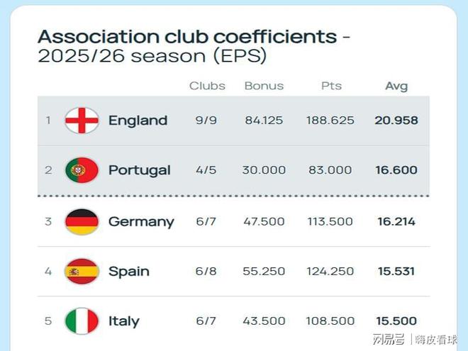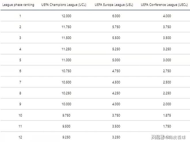 當然了,歐洲三大杯也有權重之分,歐冠的獎勵權重,比歐聯杯和歐協聯都會高一些。同一個聯賽所有球隊的積分合計,再除以總參賽球隊數量,就得出該聯賽的積分。