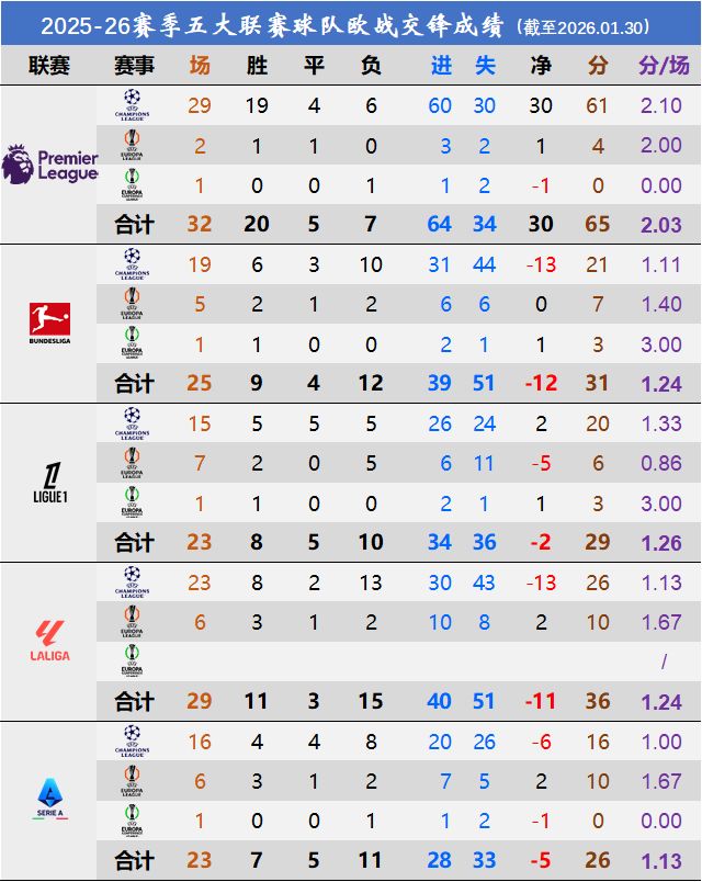 老慣例,先看五大聯(lián)賽球隊在三大杯上的整體成績。
