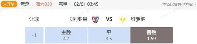 本輪在數據方面,卡利亞里近兩輪連續取勝,維羅納連續七輪沒有勝績,但數據只給到卡利亞里一檔的初始讓步,還是處于高位,與雙方目前的題材不符,所以綜合考慮,本輪看好維羅納隊不敗。
