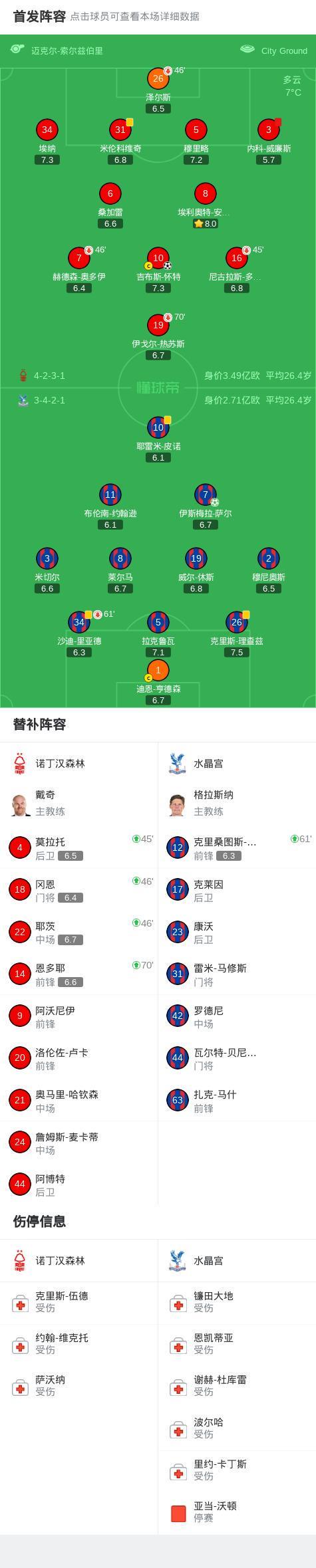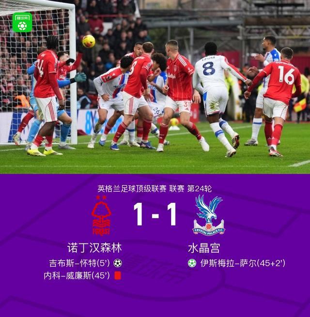 北京時間2月1日英格蘭足球頂級聯賽第24輪,諾丁漢森林主場對陣水晶宮。諾丁漢森林吉布斯-懷特破門,補時階段內科-威廉斯上演門線“撲救”被直紅罰下,隨后伊斯梅拉-薩爾點球破門。最終比分諾丁漢森林 1-1 水晶宮。