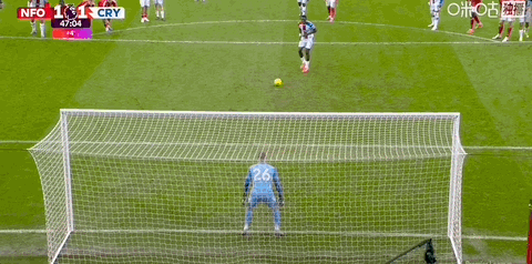 第45+1分鐘,薩爾主罰點球破門,水晶宮1-1扳平諾丁漢森林