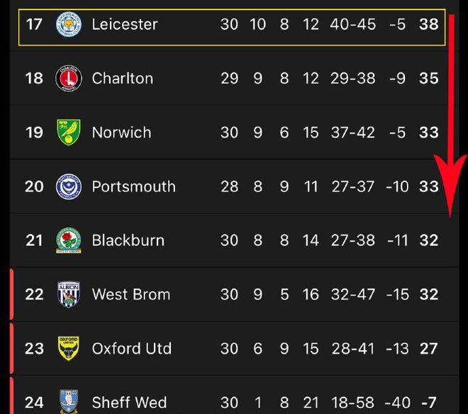 不過萊斯特城的積分已經(jīng)與降級區(qū)的西布朗同分,只是憑借10個凈勝球優(yōu)勢僥幸暫時擺脫降級區(qū)。