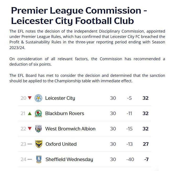 一紙官方公告,讓英格蘭足壇再次震動。北京時間2月6日,英格蘭足球聯賽(EFL)正式宣布:萊斯特城因違反盈利與可持續發展規則(PSR),被扣除6個英冠聯賽積分。盡管違規發生在2023-24賽季,且萊斯特城當賽季已經完成升級,但財務問題違規事實確鑿,“秋后算賬”那不跑不了的,處罰即刻生效,不設緩沖期。