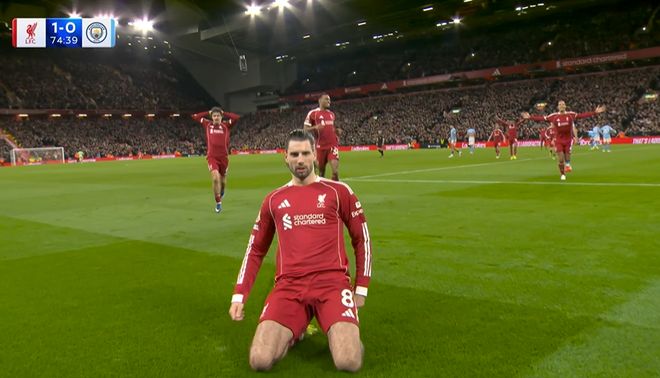 在2025-26賽季英超第25輪,利物浦主場(chǎng)對(duì)陣曼城。索博斯洛伊打入任意球世界波,復(fù)刻了對(duì)陣阿森納時(shí)的進(jìn)球。