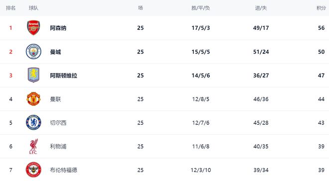 在積分榜上,阿森納依然占據(jù)榜首位置:17勝5平3負(fù),拿到56分。而曼城贏下這場(chǎng)關(guān)鍵比賽之后,總積分達(dá)到50分,排名第2,與阿森納有6分的差距。冠軍的爭(zhēng)奪還是有一定的懸念,只是曼城想要追上去難度不小。阿斯頓維拉掉隊(duì)了,只拿到47分,排名第3,與阿森納有9分的差距。曼聯(lián)的一波連勝讓其穩(wěn)居第4名,拿到44分。切爾西拿到43分緊隨其后,排名第5。利物浦輸球之后,依然是39分,排名第6,與歐冠區(qū)的曼聯(lián)有5分的差距。布倫特福德也是39分,排名第7。