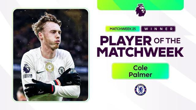切爾西攻擊手科爾-帕爾默在球隊3-1客勝狼隊的比賽中發揮驚艷,當選英超第25輪最佳球員。