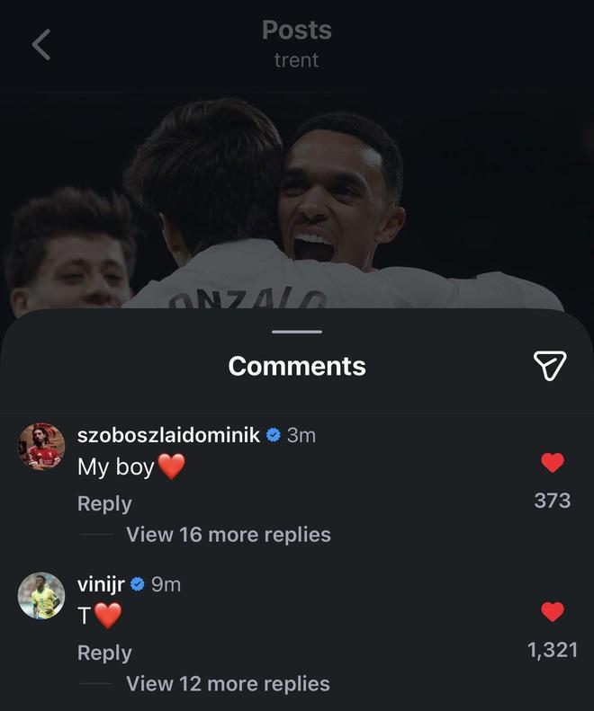 賽后,阿諾德更新社交媒體動態寫道:“回來真好”隨后,維尼修斯、利物浦球星索博斯洛伊評論。維尼修斯寫道:“T??”;索博斯洛伊寫道:“我的男孩??”