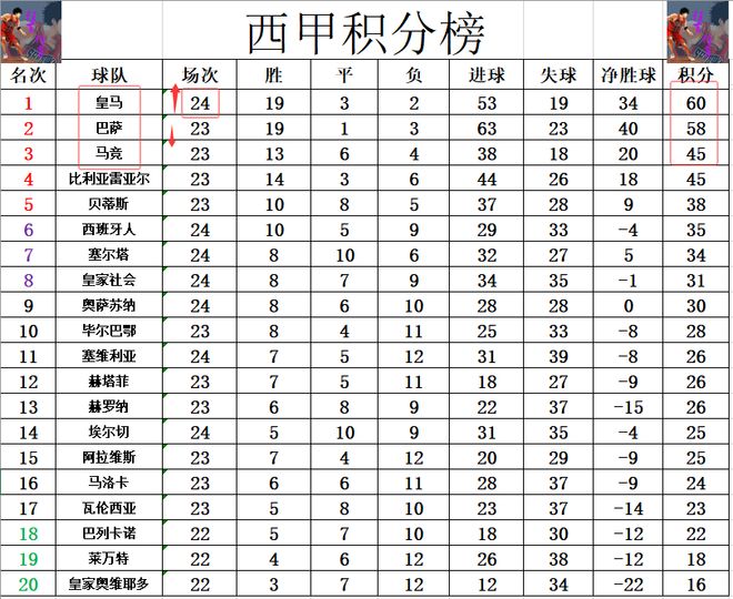積分榜方面,皇馬先賽大勝后,再次暫時超過巴薩2分登頂,也是再次把壓力甩給了巴薩。馬競,比利亞雷亞爾差皇馬15分排在第3,第4。西班牙人下半程戰績急速下滑,今天又是無力贏球,多賽的情況下,還差貝蒂斯3分。