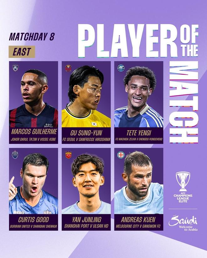 亞冠官方公布了亞冠精英聯(lián)賽第八輪各場比賽單場最佳球員。