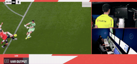 VAR迅速介入,裁判回看后做出改判,取消黃牌,認(rèn)定庫爾圖瓦犯規(guī),判罰點(diǎn)球。