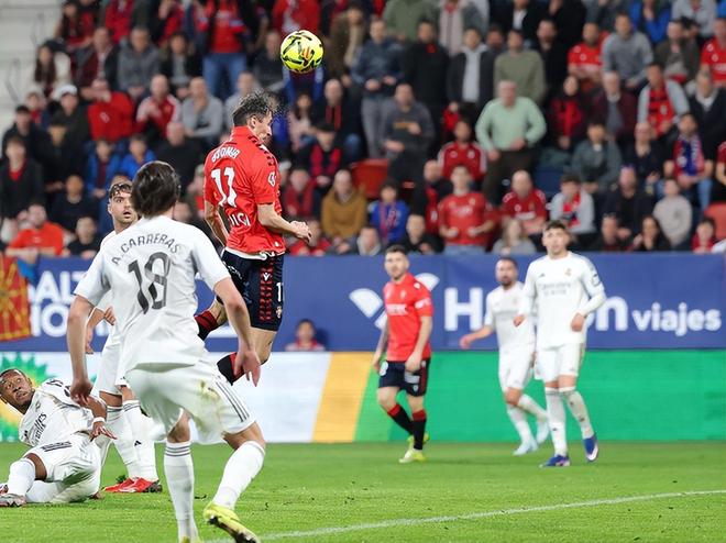 主場作戰的奧薩蘇納士氣正佳,比賽開始后他們反而占據著進攻主導權;第24分鐘,魯文-加西亞右路傳中,布季米爾頭球頂在卡雷拉斯背上反彈,庫爾圖瓦神級反應上演精彩撲救;第27分鐘,哈維-加蘭左側斜線傳中,布季米爾搶點頭槌擊中立柱彈出!