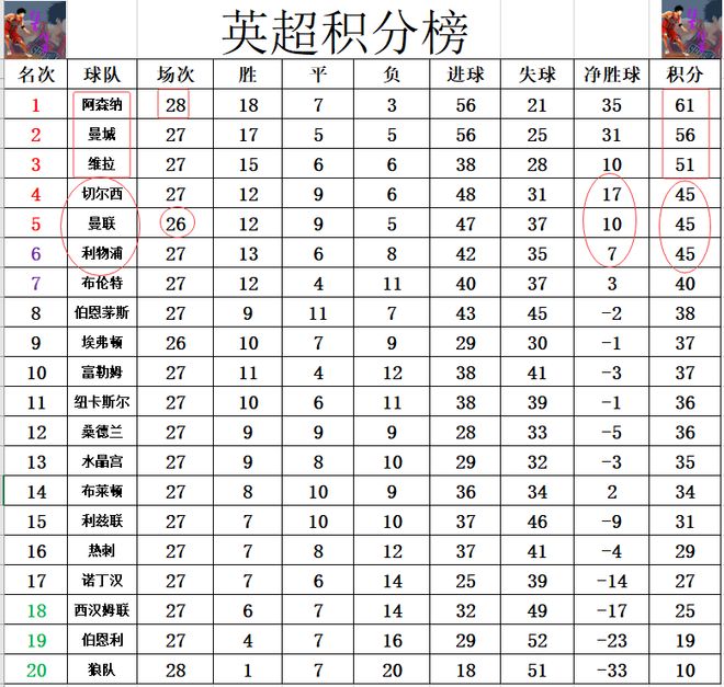 積分榜方面,阿森納客場大勝熱刺止住頹勢,多賽一場的情況下,再次領先曼城5分,維拉差阿森納10分排在第3。利物浦輸給曼城后及時找回狀態,今天小勝后奪取連勝,追上了切爾西和曼聯,三隊目前同積45分,爭4還是非常激烈。