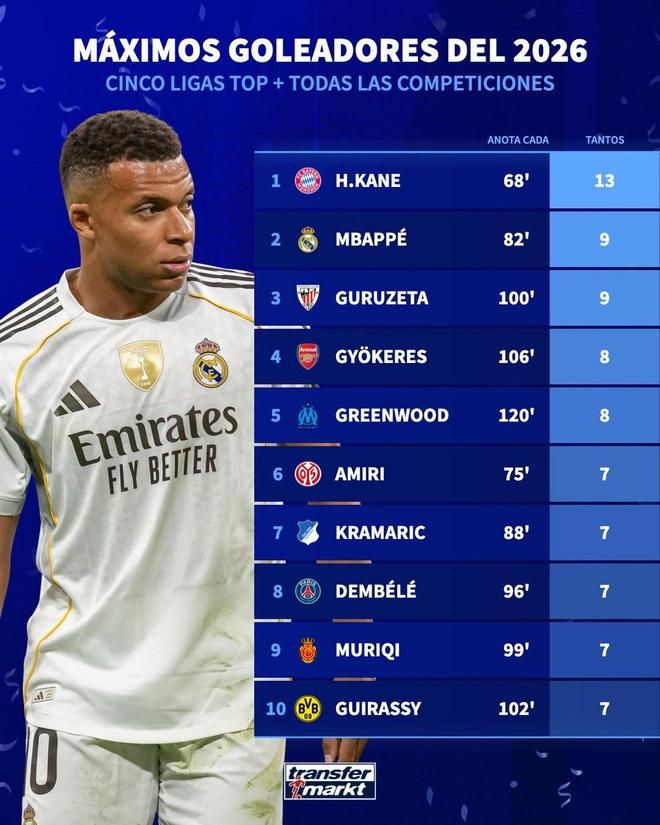 北京時間2月24日,德轉統計出了2026年至今歐洲五大聯賽球員各項賽事的進球榜,哈里-凱恩以13球排名第一,姆巴佩9球位列第二,哲凱賴什、格林伍德、登貝萊以及吉拉西上榜。