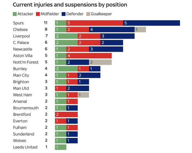 英超各隊傷病與停賽情況統計數據顯示,托特納姆熱刺目前正遭遇嚴重的人員危機,以11人的傷停總數位列英超所有球隊之首。
