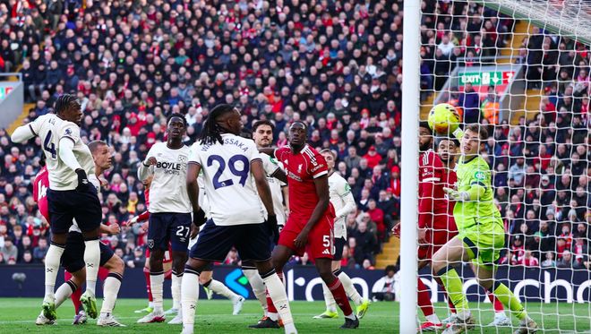 3分鐘后,薩默維爾的射門力量十足,阿利松做出關(guān)鍵撲救,西漢姆聯(lián)獲得角球。