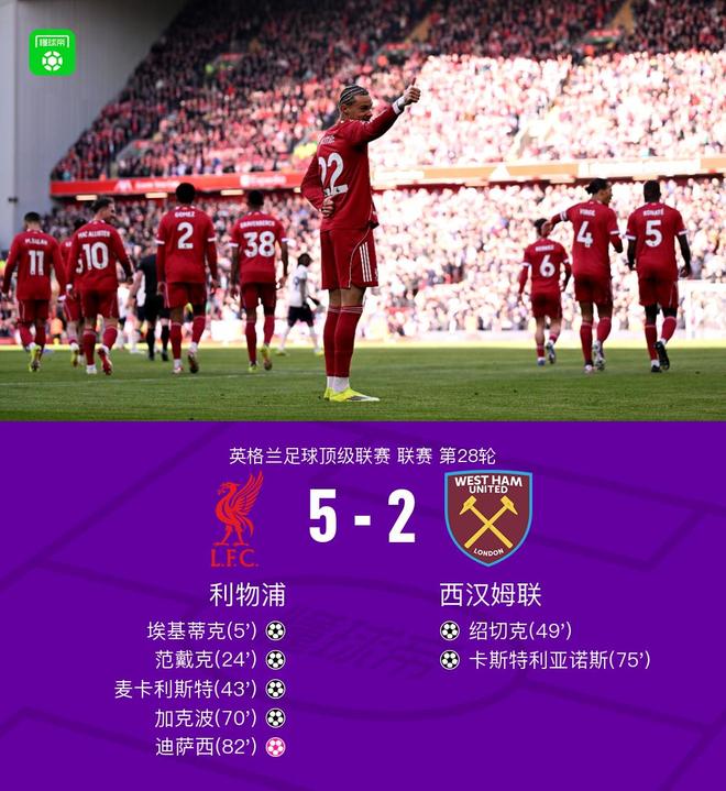 北京時間2月28日,英超聯(lián)賽第28輪,利物浦主場迎戰(zhàn)西漢姆聯(lián)。上半場,埃基蒂克開場閃擊后又助攻麥卡利斯特破門,索博斯洛伊助攻范戴克頭球建功;下半場,紹切克、卡斯特利亞諾斯為西漢姆聯(lián)各扳一城,?;倏酥ゼ涌瞬〝U(kuò)大領(lǐng)先,替補(bǔ)登場的弗林蓬造成迪薩西自擺烏龍。最終,利物浦5-2大勝西漢姆聯(lián),各項(xiàng)賽事4連勝。