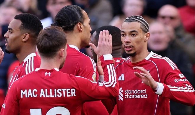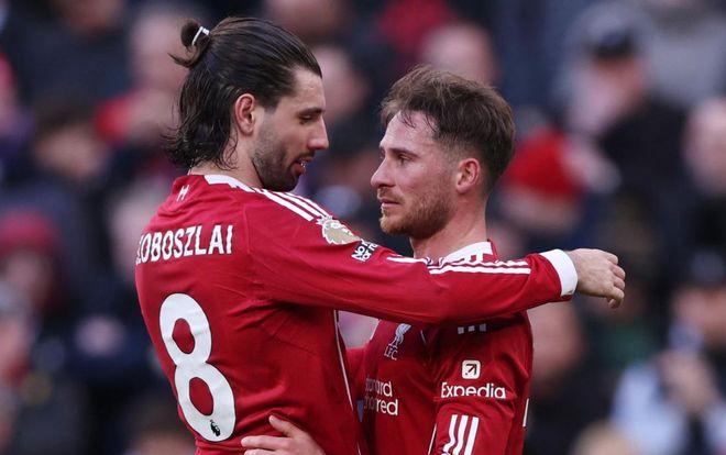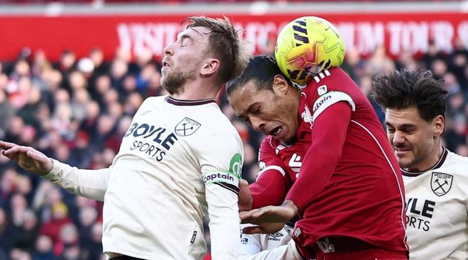 第24分鐘,利物浦再次進球。索博斯洛伊開出角球,范戴克搶點頭球攻門,球進了!6分鐘后,阿利松出現(xiàn)低級失誤,竟然把球踢到對方身上。幸好皮球反彈的力量比較小,讓阿利松能夠把球攔下來,避免造成丟球。第37分鐘,紹切克小禁區(qū)包抄射門被門將化解。6分鐘后,麥卡利斯特進球繼續(xù)擴大比分。半場結束,利物浦3-0領先西漢姆聯(lián)。