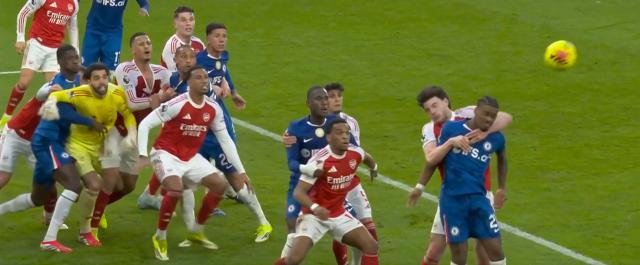 此球讓切爾西在上半場補時階段將比分追平為1比1,但破門之前,還有一段頗為讓人在意的場景:得分角球來自拉亞將藍軍的前一次角球進攻飛身撲出底線,但攻門的也不是切爾西球員,而是賴斯的手臂;從某種意義上來講,槍手中場似乎算“被動手球”,畢竟他手搭在對方后衛哈托的肩膀上躲不開。“那這不就是抱人犯規嗎?”切爾西的支持者們如此主張,但現場的藍軍隊員卻也沒有提出抗議,可能是因為沒看清,也可能是因為另一名藍軍后衛薩爾抱住了門將拉亞,真扯皮起來也很難扯個明白。