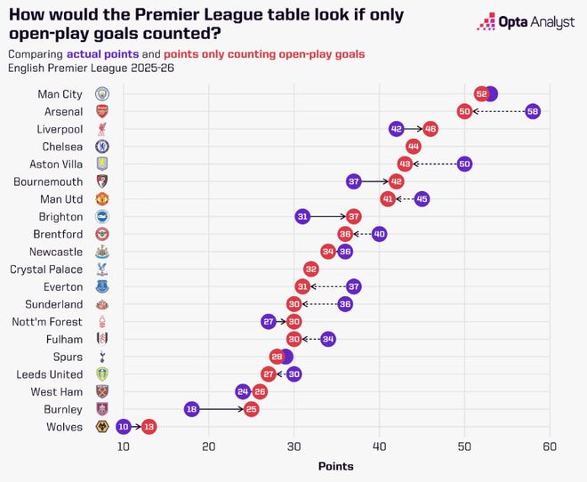 ▲如果僅計算運(yùn)動戰(zhàn)進(jìn)球,英超聯(lián)賽的排名表變化。
