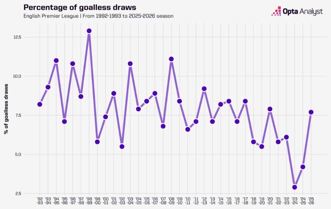 過度看重定位球戰(zhàn)術(shù),導(dǎo)致英超0比0比賽數(shù)量上升。本賽季英超已有19場0比0的比賽,超過2024/25賽季(16場)和2023/24賽季(11場),白卷比賽占比(6.8%)也連續(xù)3個賽季上升。白卷場次增加與進(jìn)球數(shù)下降正向相關(guān),各隊癡迷定位球得分,導(dǎo)致射門數(shù)也在下降。本賽季場均射門次數(shù)(24.4次),是2003/04賽季以來第二低,僅高于2020/21賽季(場均24.2次)。那個賽季因疫情,大部分比賽球員發(fā)揮都低于預(yù)期。