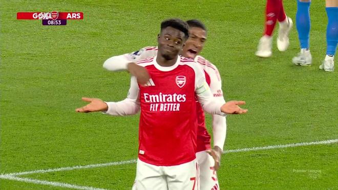 此役客場對陣布萊頓,作為隊長首發出戰的薩卡在比賽第9分鐘破門,幫助阿森納取得1-0領先。