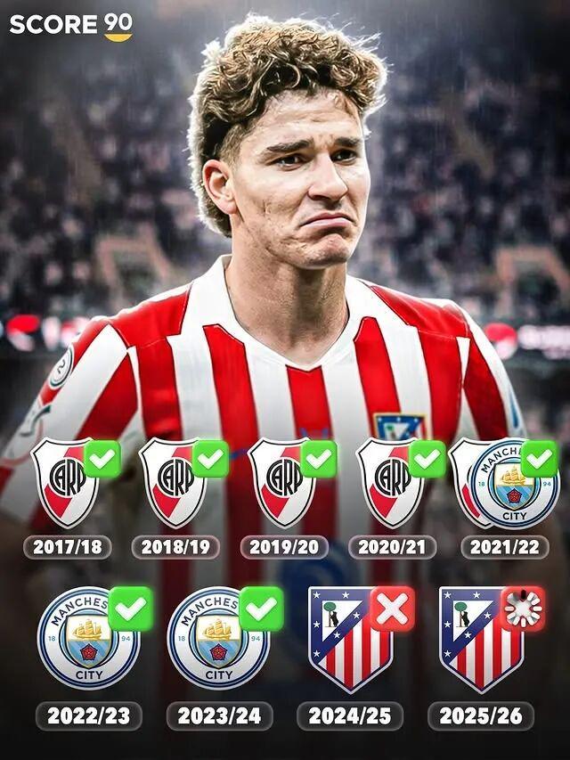 現年26歲的阿爾瓦雷斯,曾是足壇公認的“冠軍體質”球員,職業生涯起步便順風順水,出道前7年狂攬17座冠軍獎杯,2018年至2024年間更是年年捧杯,從未經歷過無冠賽季。世界杯冠軍、歐冠冠軍、英超冠軍、美洲杯冠軍、南美解放者杯冠軍等重量級錦標悉數收入麾下,年紀輕輕便實現了俱樂部與國家隊層面的榮譽大滿貫,這份奪冠履歷在同齡球員中堪稱獨一檔。