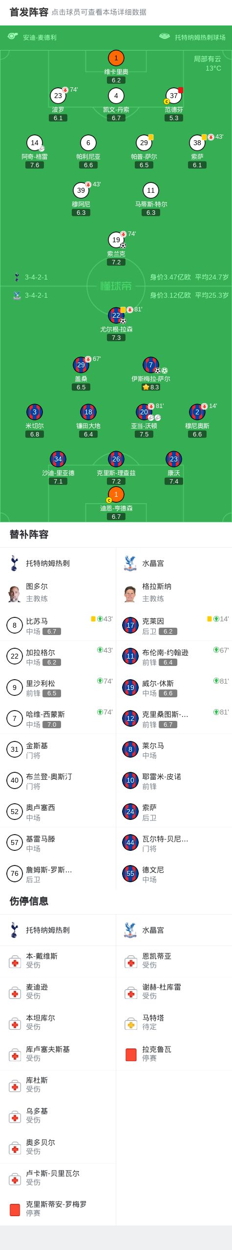 北京時間3月6日英格蘭足球頂級聯賽 聯賽 第29輪,托特納姆熱刺主場對陣水晶宮。上半場,阿奇-格雷助攻索蘭克破門。范德芬拉倒薩爾送點并且被直紅罰下,薩爾罰入點球扳平比分。沃頓送出兩次助攻,拉森和薩爾相繼建功。下半場,兩隊均無建樹。全場比賽結束,熱刺1-3不敵水晶宮,遭遇各項賽事的5連敗和英超連續11輪不勝。