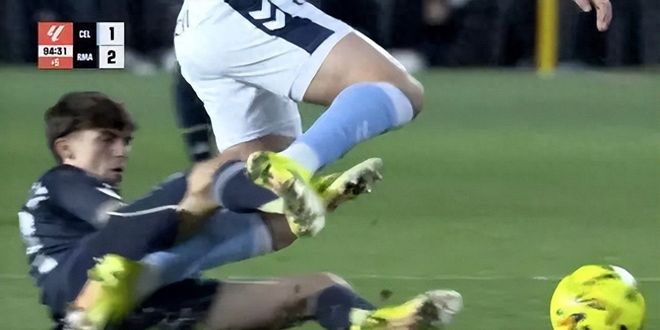 比賽的轉(zhuǎn)折點發(fā)生在補時階段。當時比分膠著,皇馬球員曼努埃爾·安赫爾在一次拼搶中倒地,試圖從塞爾塔球員費爾·洛佩斯腳下斷球。電視回放清晰地顯示,這位皇馬青訓小將根本沒有觸碰到皮球,而是直接伸出右腿將對方絆倒。