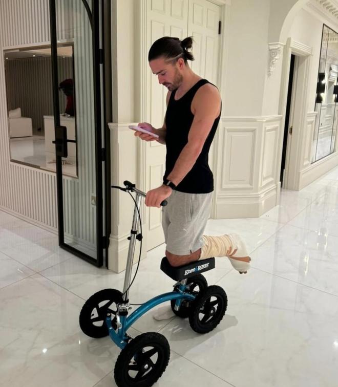 上月因腳部傷勢接受了賽季報銷的手術,格拉利什的腳部被大面積包扎,還不得不穿上醫用護靴。但他選擇在逆境中保持積極心態,在社媒寫道:“術后第四周,正刻苦康復,只為變得更好、更強,重返賽場。”