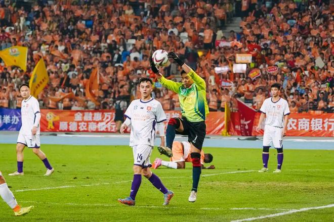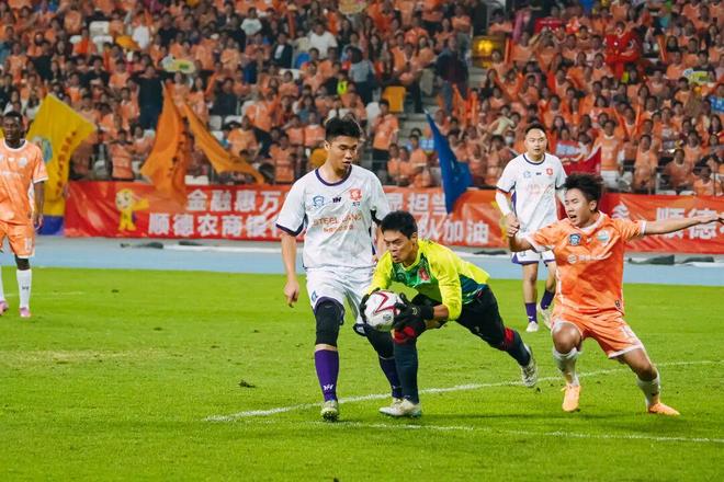 這位扎根龍江隊十年的老門將,并非專業(yè)球員,而是廣東聯(lián)容電子有限公司一位精益工程師。足球于他而言,是愛好更是解壓方式。此次順德“德甲”的大舞臺,讓他迎來了踢球生涯的“高光時刻”。“能和隊友在德勝球館超過萬人的現(xiàn)場踢球,我覺得特別開心!”即便最終未能取勝,區(qū)志東仍為球隊的表現(xiàn)感到驕傲。