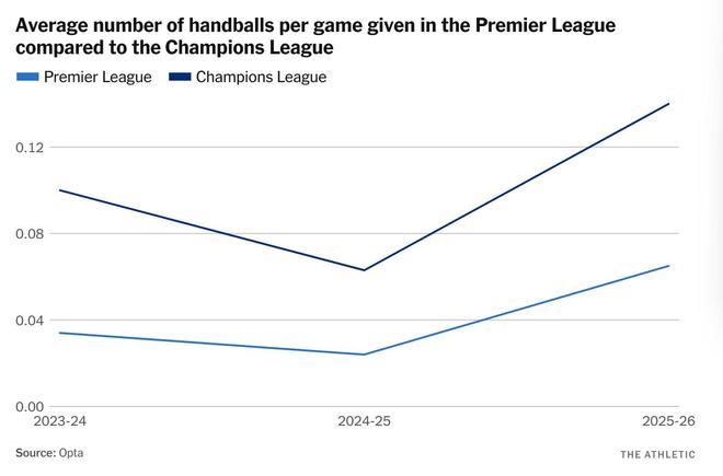 統計數據很清晰。歐冠聯賽中因手球犯規被判罰點球的次數是英超的兩倍多。