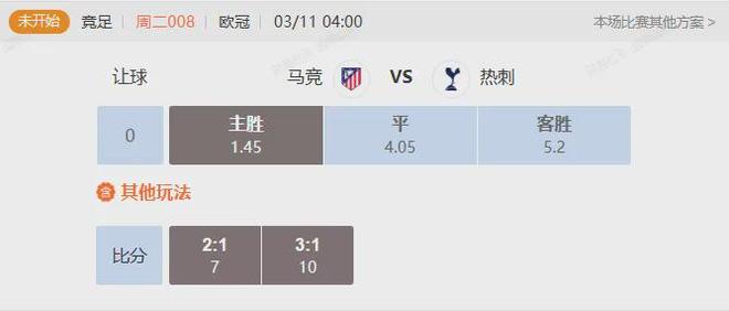 從數據來看,馬競本賽季主場戰績出色,西甲賽場上14個主場取勝12場,歐冠五個主場也拿到4勝1負的出色戰績,不過防守端的問題是需要西蒙尼注意的;本輪雖然對陣聯賽中表現掙扎的熱刺,但熱刺歐冠賽場上表現不錯,因此馬競還是要盡量把握主場機會拿到優勢;