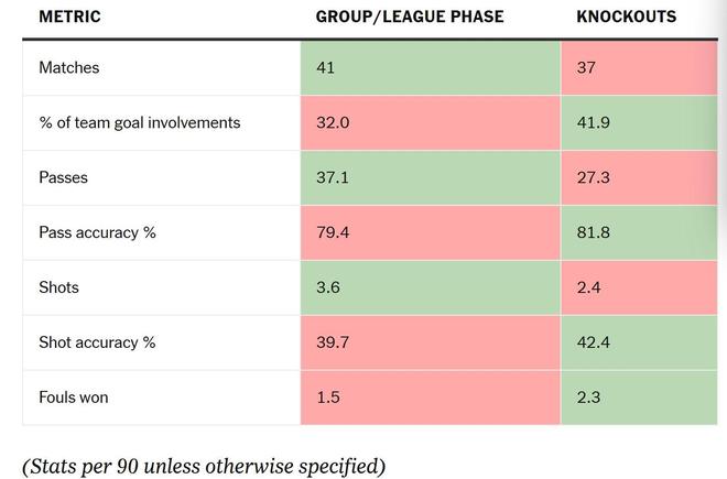維尼修斯個人在淘汰賽階段的傳球和射門次數較少,但準確率略有提高,贏得更多犯規,并且他對皇馬進球的貢獻占比(球隊62球中占26球)高于小組/聯賽階段(球隊97球中占31球)。