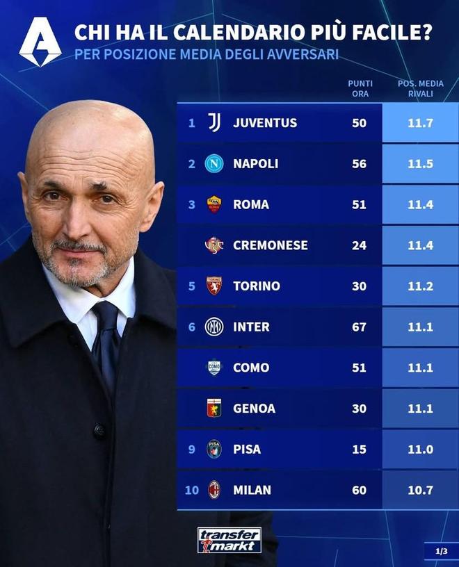 北京時間3月11日,德轉統計出了本賽季意甲剩余10輪各支球隊將會遭遇的對手在聯賽中的平均排名,其中尤文圖斯的最后10個對手目前平均排名第11.7位,為所有球隊最低。目前7分優勢領跑積分榜的國際米蘭最后10輪對手的平均排名則為11.1位。