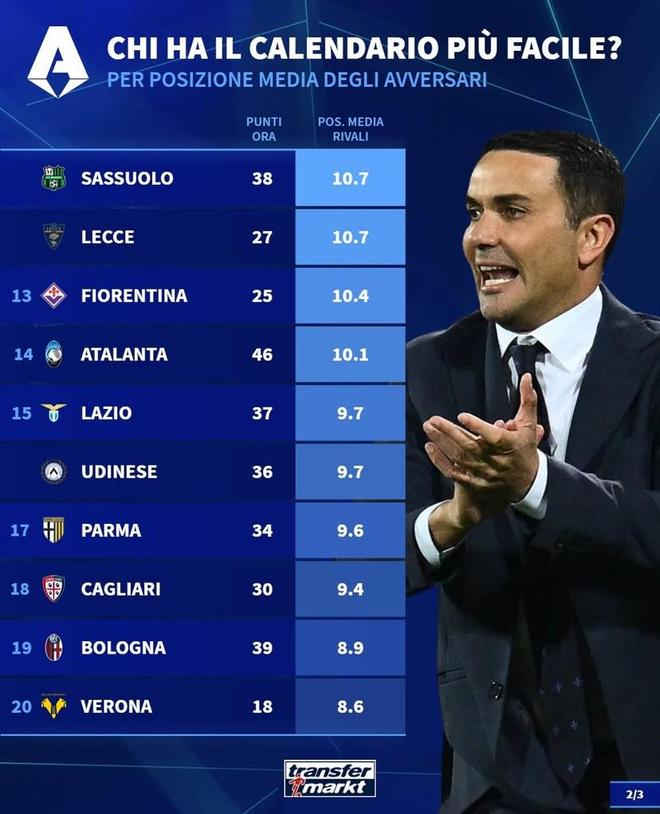 德轉統計本賽季意甲最后10輪各隊對手平均排名: