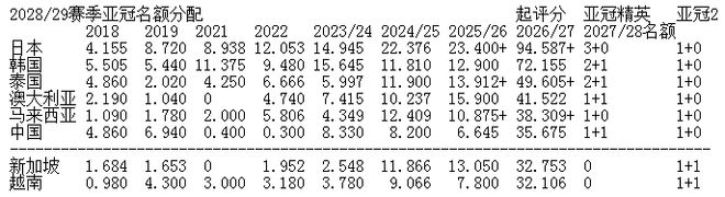 而在中超身后,新加坡聯賽(32.753分)和越南聯賽(32.106分)也在迫近。本賽季新加坡聯賽球隊亞戰積分比中超多了7.117分,越南聯賽球隊也比中超多1.284分,新賽季都存在追上中超的可能性。鑒于新加坡、越南聯賽參賽球隊少,每場勝利增加的亞戰積分都比中超多,為本就一勝難求的中超積分壓制對手增加了難度。