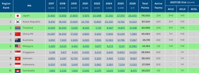 這意味著今夏2026/27賽季亞冠兩大聯賽揭幕之際,決定2028/29賽季亞戰名額分配的總積分,中超“起評分”僅排名東亞區第6位。不但被日韓泰遠遠拋離,甚至被澳超和馬來超甩在身后,新加坡和越南聯賽還在緊緊追趕。