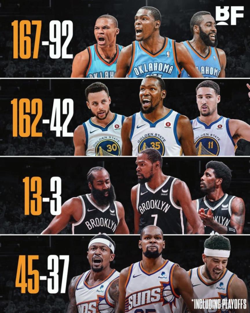 杜蘭特各階段三巨頭勝率:籃網時代13-3,太陽時代拉完了